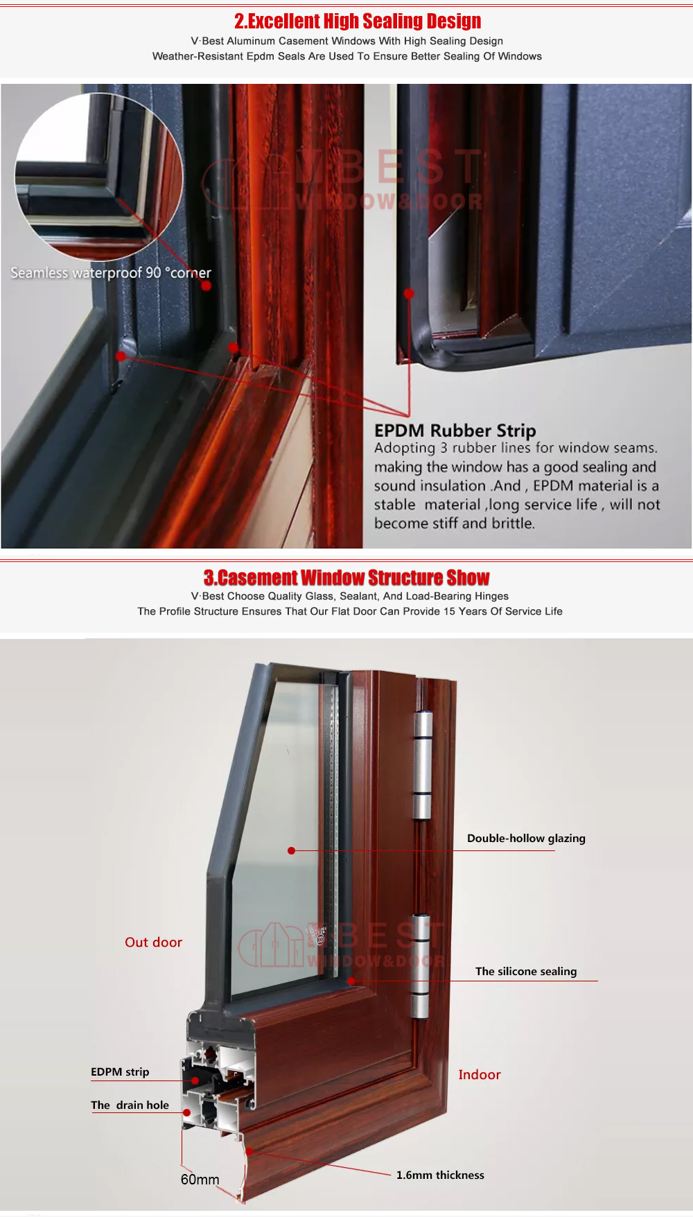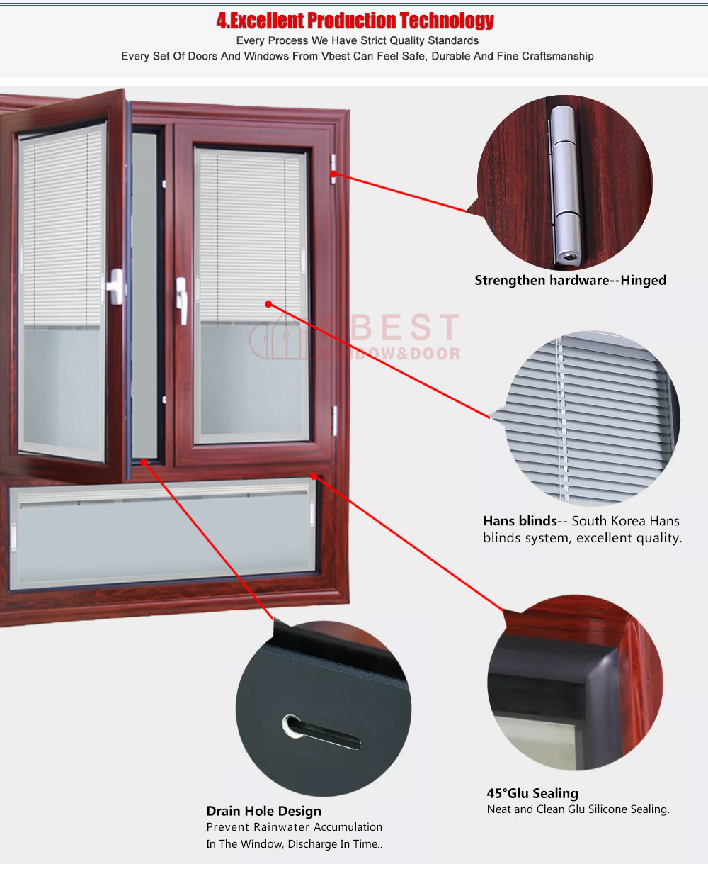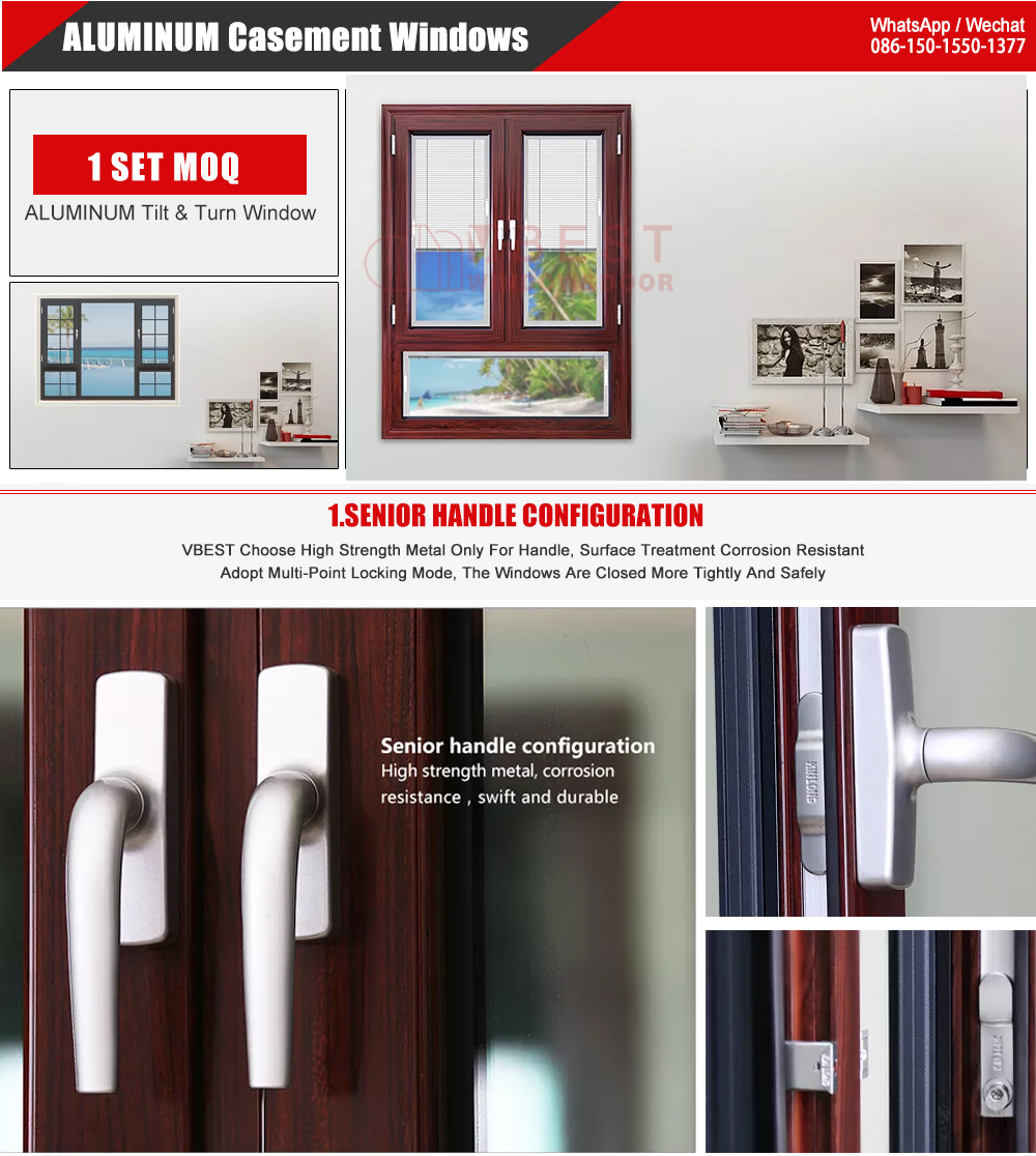 VBEST's 60# Thermal bridge aluminum alloy casement window is a small thermal break casement window that we hot sale. It has the characteristics of low price, excellent sound insulation, good waterproof and sealing performance. It can be used to design a variety of window types. 1.8mm profiles thickness, with good impact resistance