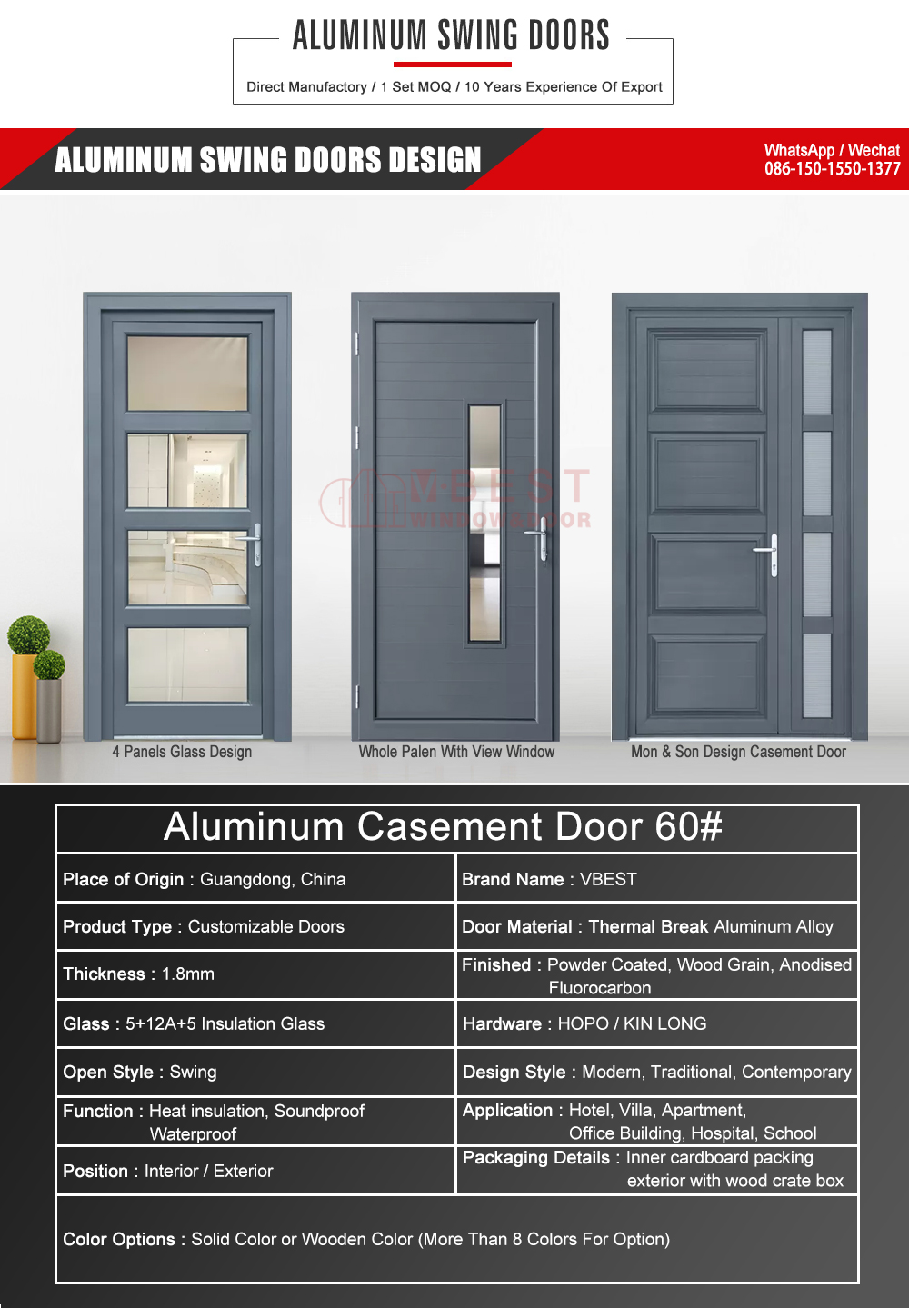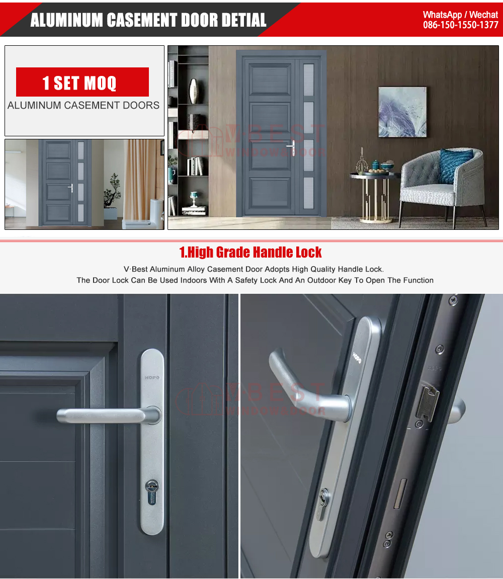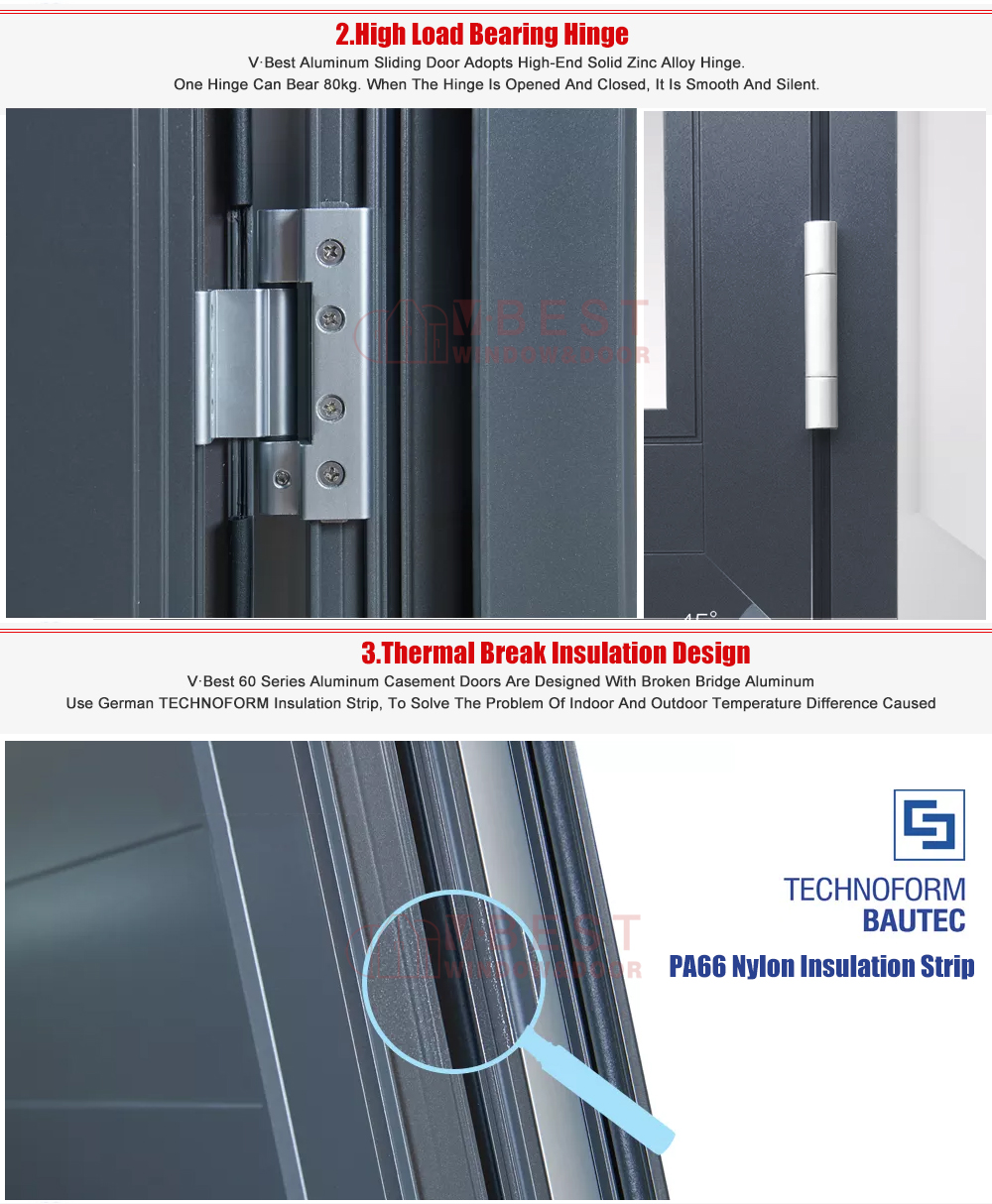 VBEST 60# aluminum alloy Hinge door is good, it can effectively prevent wind and dust or other debris from entering the house, and the swing door is protected by a layer of glue than the other doors; the swinging door opens and closes with low noise.We are happy to make custom casement doors according to your projects.